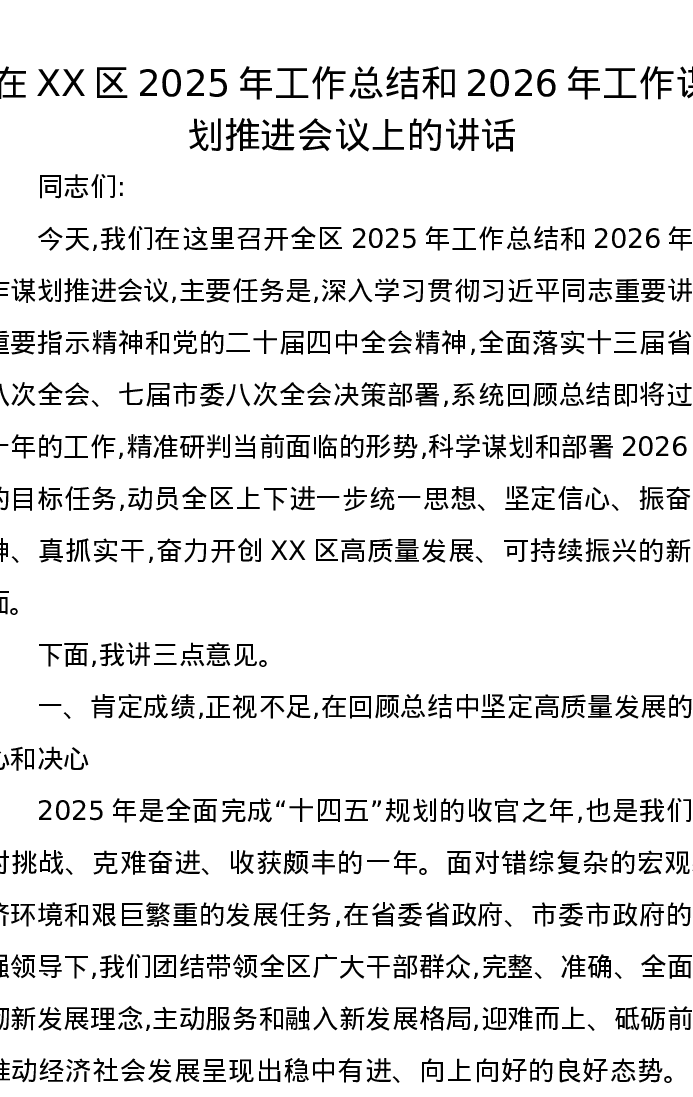 在XX区2025年工作总结和2026年工作谋划推进会议上的讲话