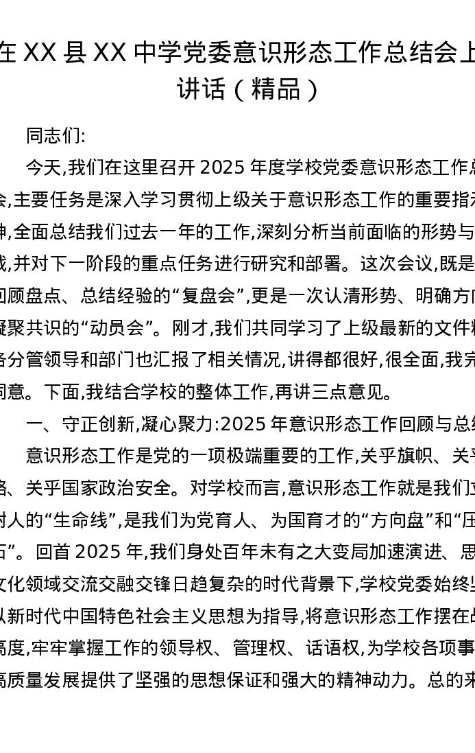 在XX县XX中学党委意识形态工作总结会上的讲话
