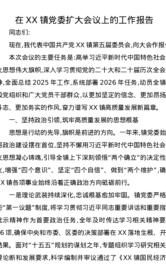 在XX镇党委扩大会议上的工作报告