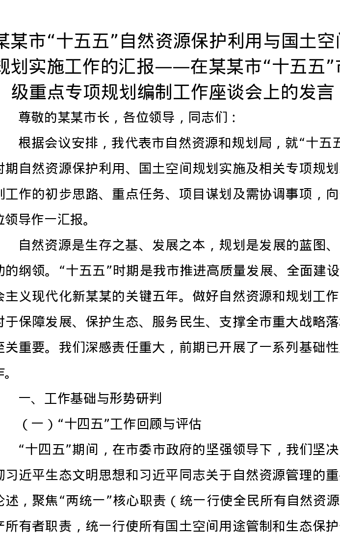 某某市十五五自然资源保护利用与国土空间规划实施工作的汇报——在某某市十五五市级重点专项规划编制工作座谈会上的发言