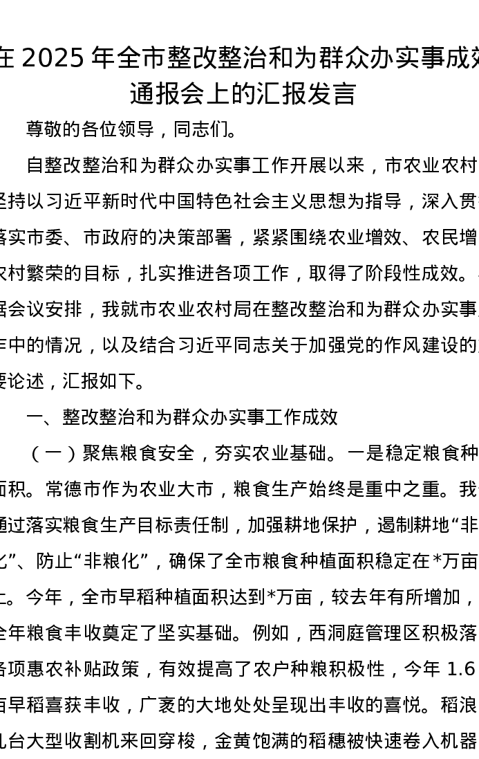 在2025年全市整改整治和为群众办实事成效通报会上的汇报发言