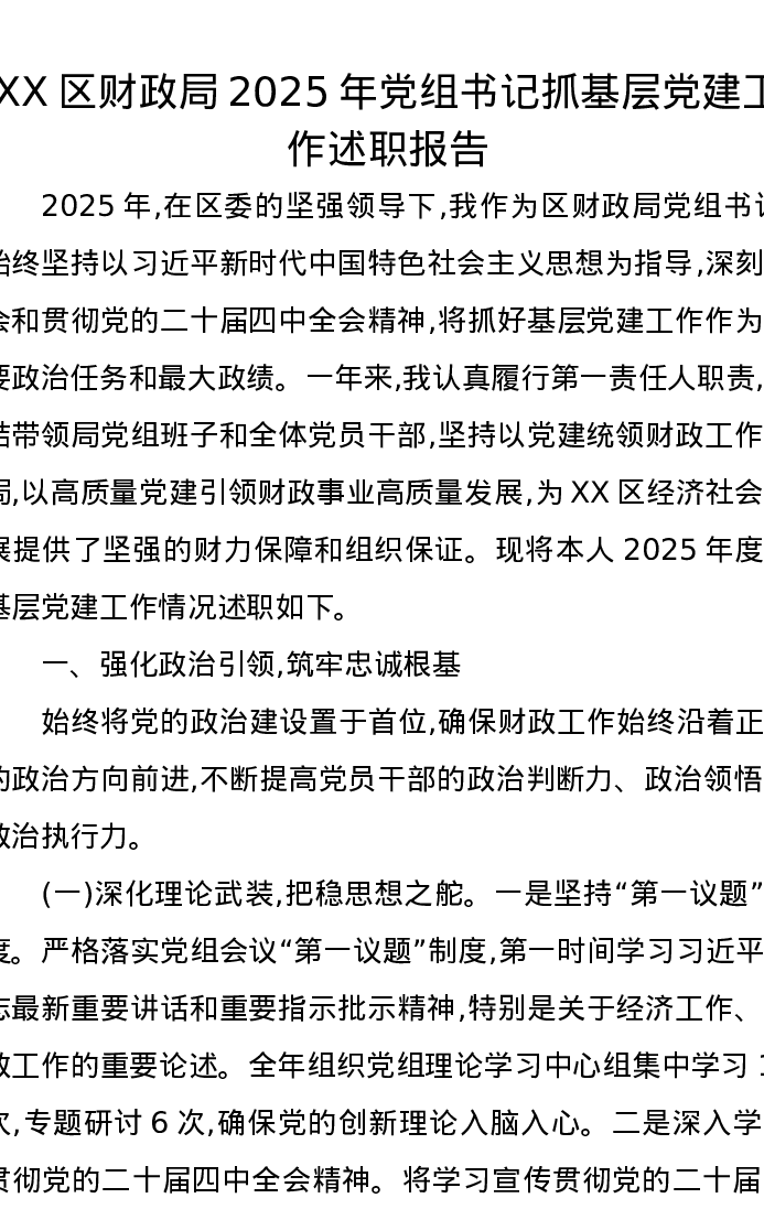 XX区财政局2025年党组书记抓基层党建工作述职报告