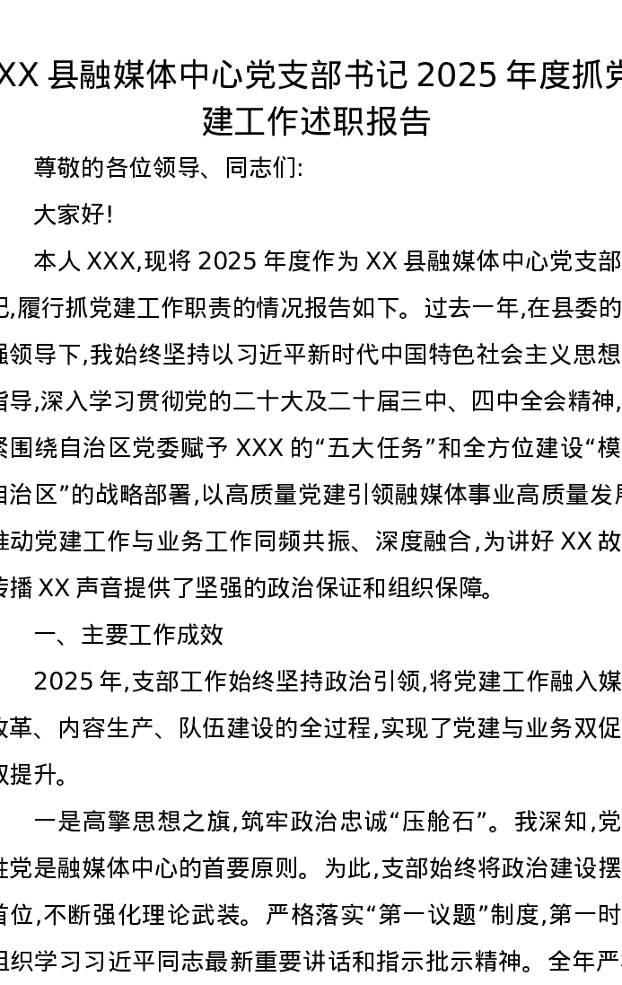 XX县融媒体中心党支部书记2025年度抓党建工作述职报告