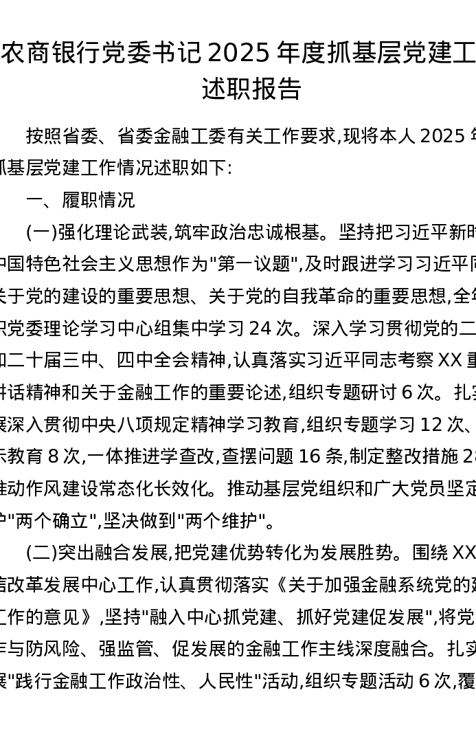 农商银行党委书记2025年度抓基层党建工作述职报告