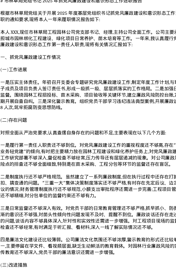 市林草局党组书记2025年抓党风廉政建设和意识形态工作述职报告