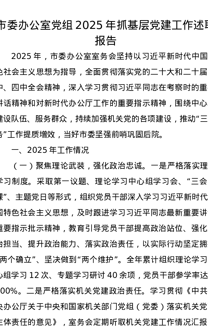 市委办公室党组2025年抓基层党建工作述职报告