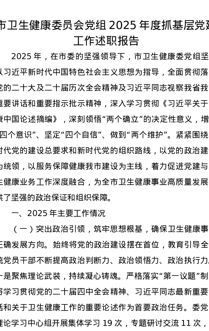 市卫生健康委员会党组2025年度抓基层党建工作述职报告