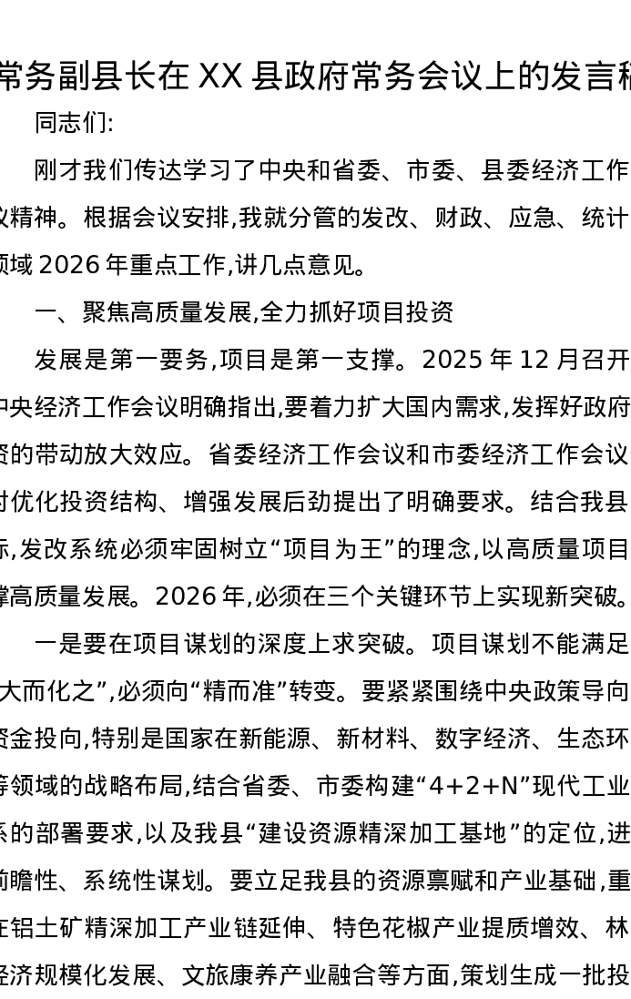 常务副县长在XX县政府常务会议上的发言稿