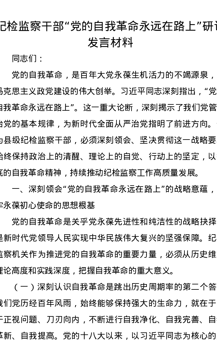 纪检监察干部党的自我革命永远在路上研讨发言材料