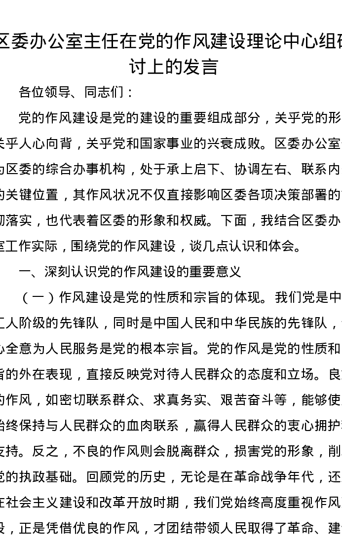 区委办公室主任在党的作风建设理论中心组研讨上的发言