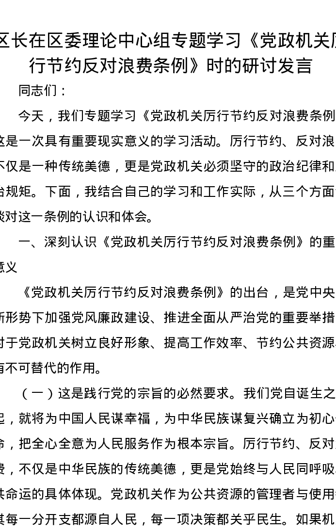 区长在区委理论中心组专题学习《党政机关厉行节约反对浪费条例》时的研讨发言