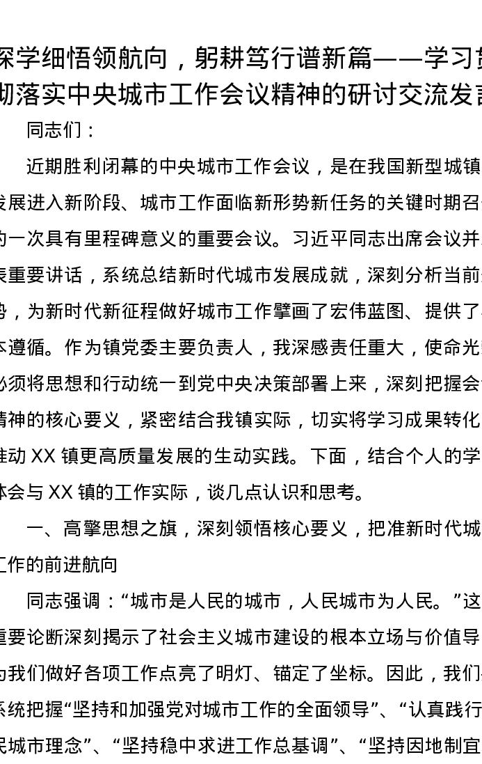 深学细悟领航向,躬耕笃行谱新篇——学习贯彻落实中央城市工作会议精神的研讨交流发言