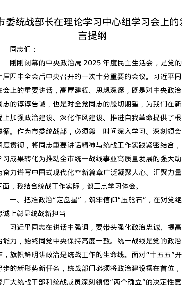 市委统战部长在理论学习中心组学习会上的发言提纲