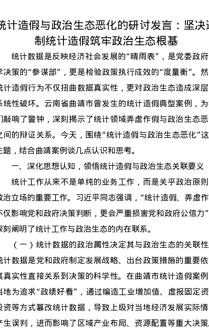 统计造假与政治生态恶化的研讨发言:坚决遏制统计造假筑牢政治生态根基