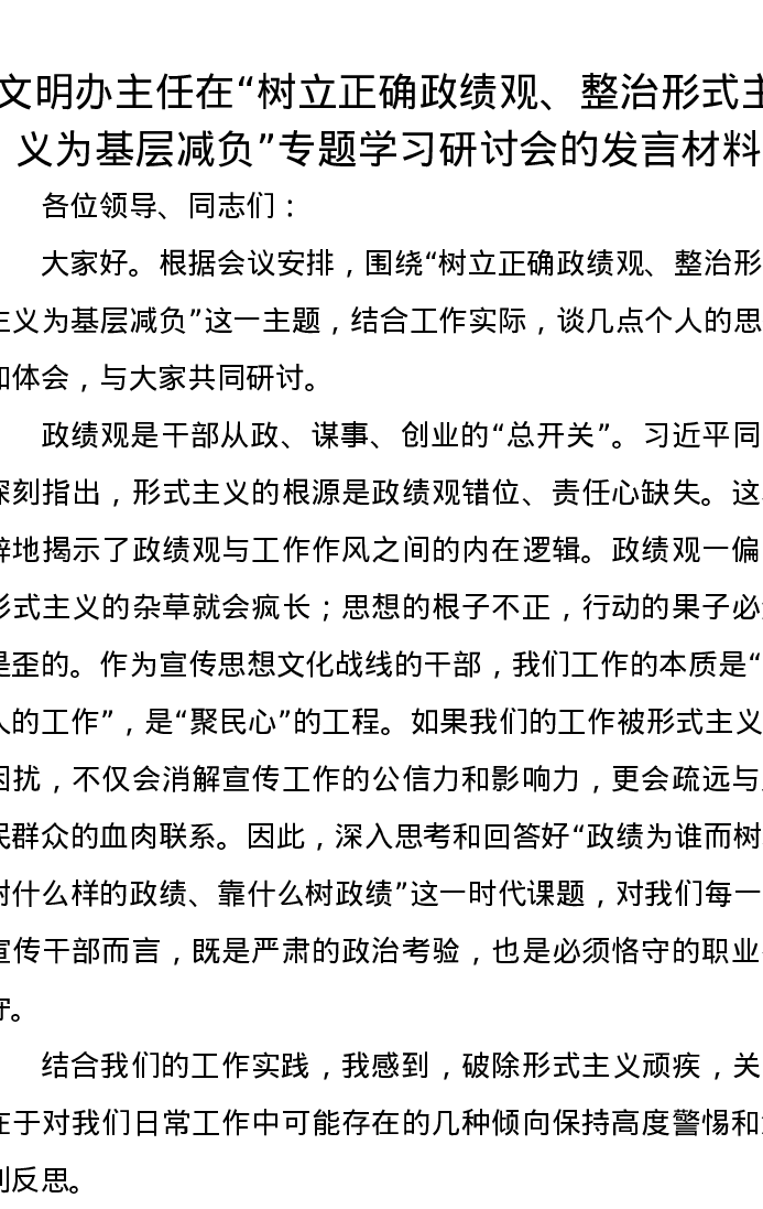 文明办主任在树立正确政绩观、整治形式主义为基层减负专题学习研讨会的发言材料