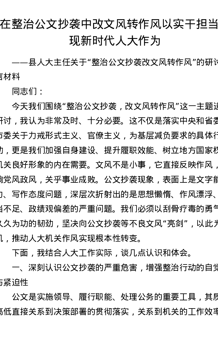 县人大主任关于整治公文抄袭 改文风转作风的研讨发言材料(3826字)