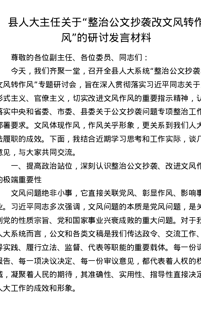 县人大主任关于整治公文抄袭 改文风转作风的研讨发言材料