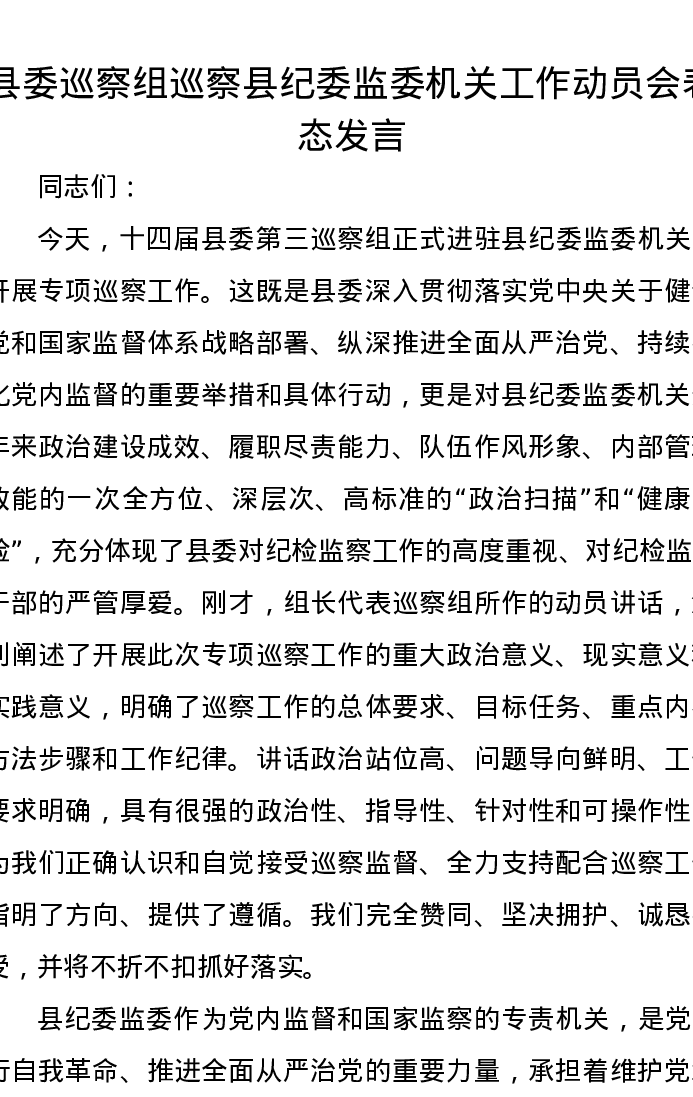 县委巡察组巡察县纪委监委机关工作动员会表态发言