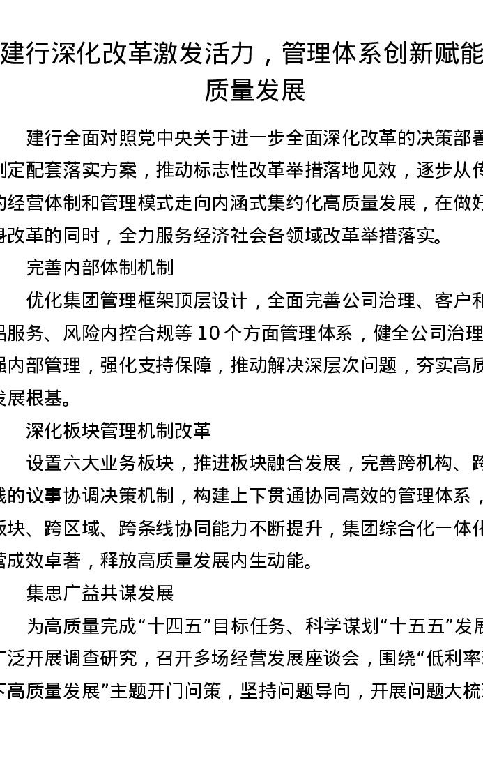 银行研讨发言:建行深化改革激发活力,管理体系创新赋能高质量发展