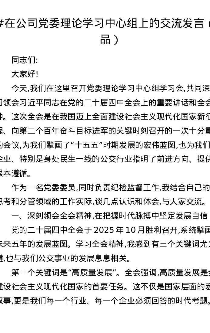 在公司党委理论学习中心组上的交流发言