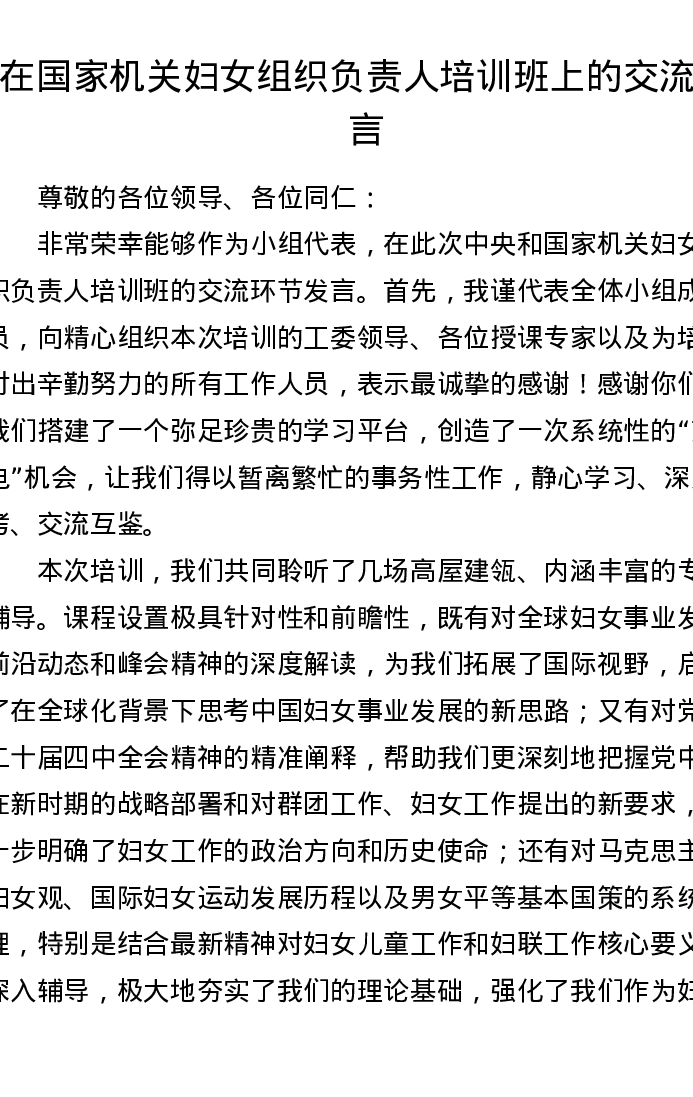 在国家机关妇女组织负责人培训班上的交流发言