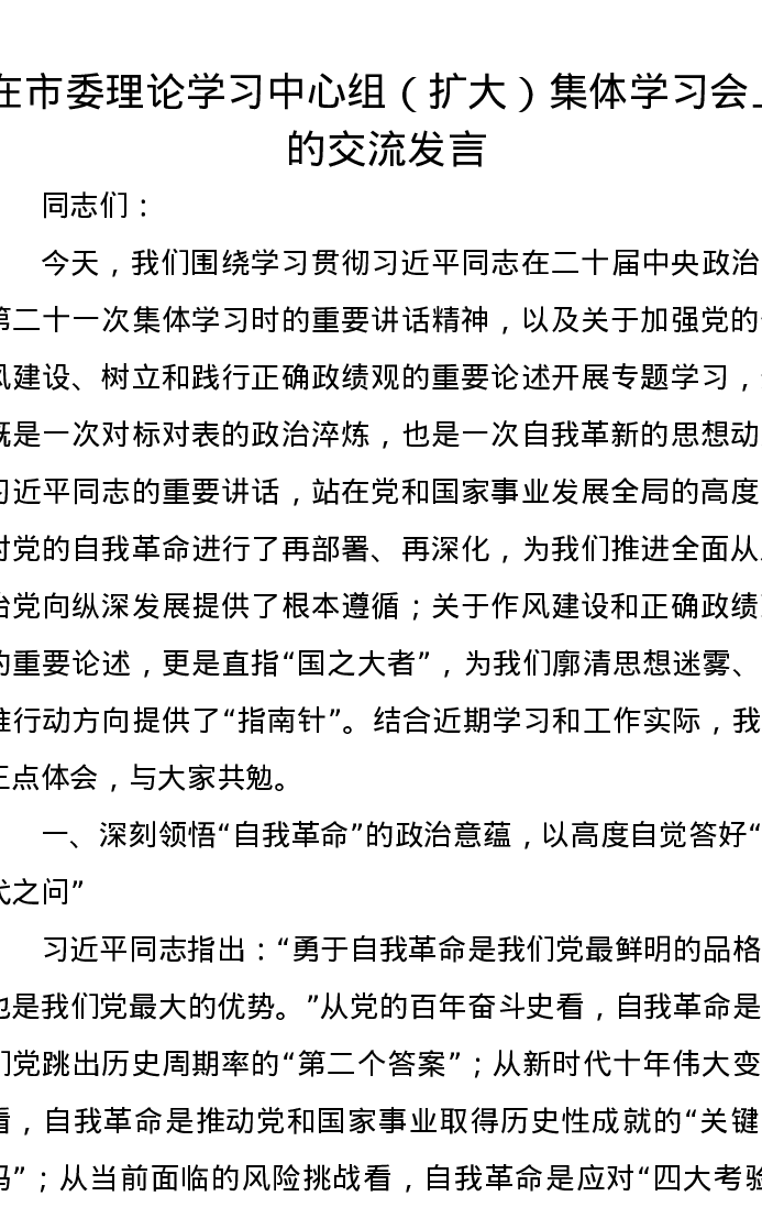 在市委理论学习中心组(扩大)集体学习会上的交流发言
