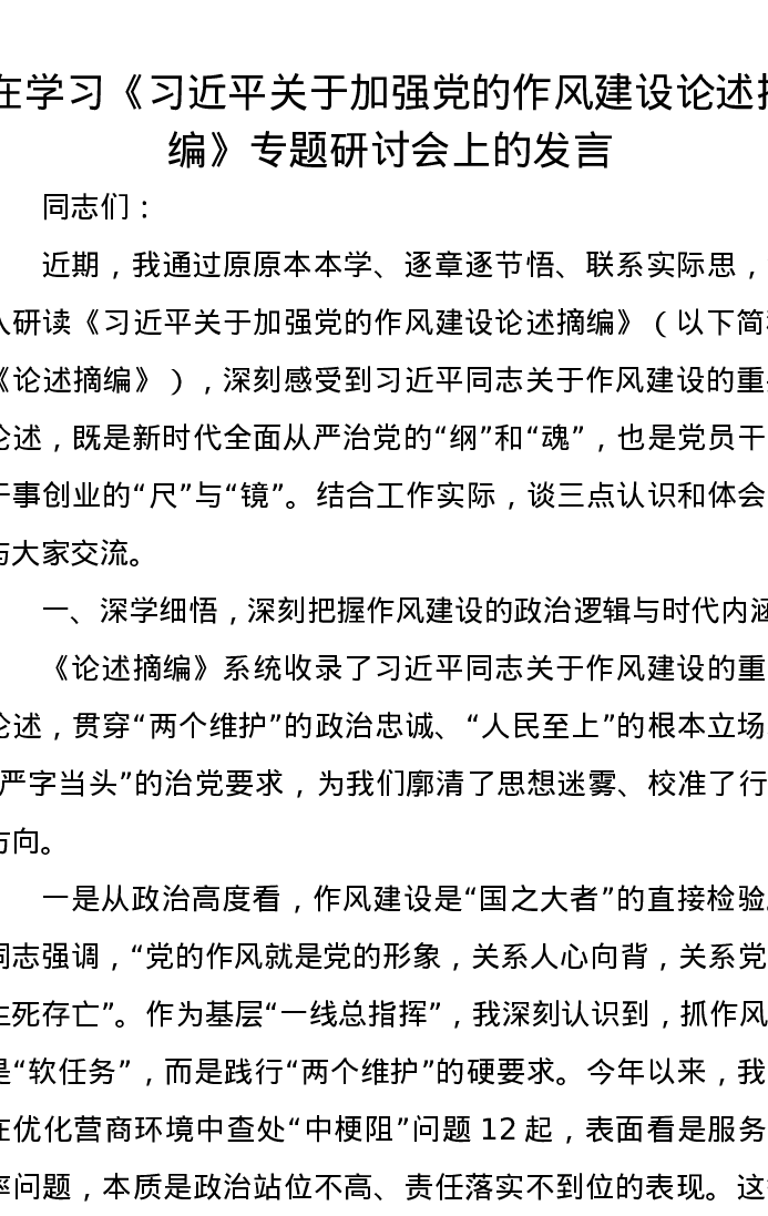 在学习《习近平关于加强党的作风建设论述摘编》专题研讨会上的发言