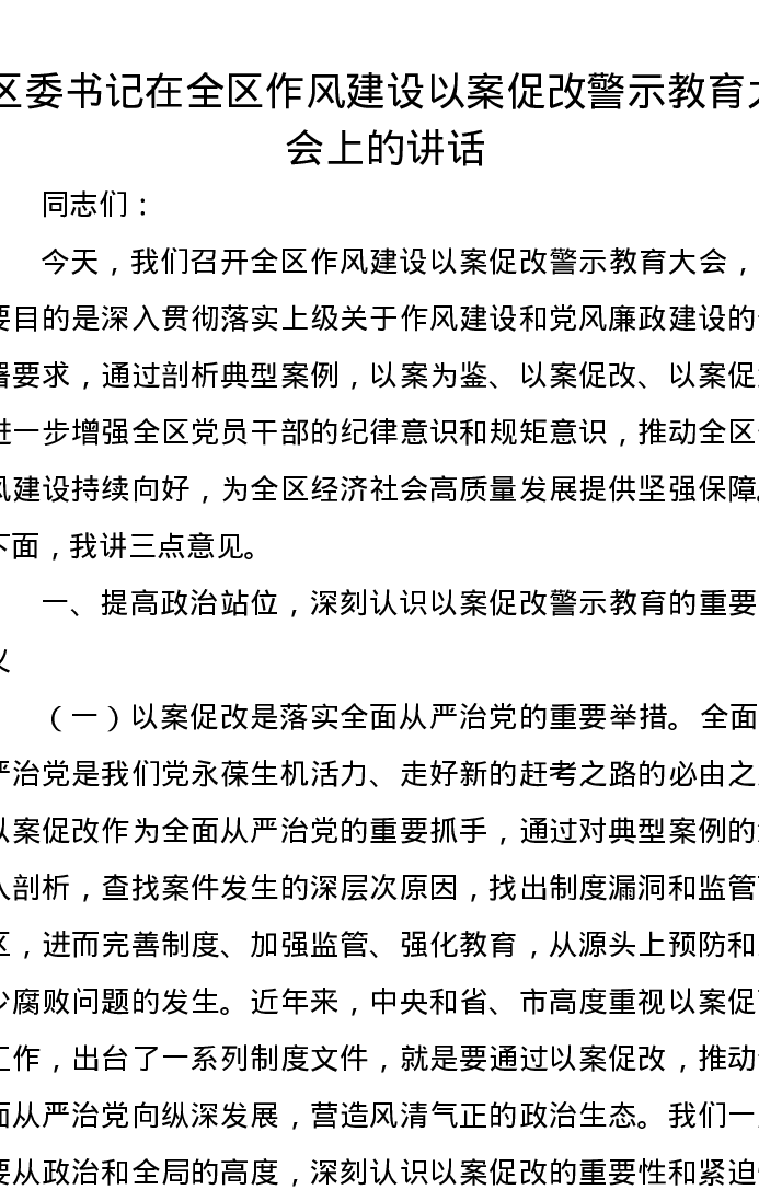 区委书记在全区作风建设以案促改警示教育大会上的讲话