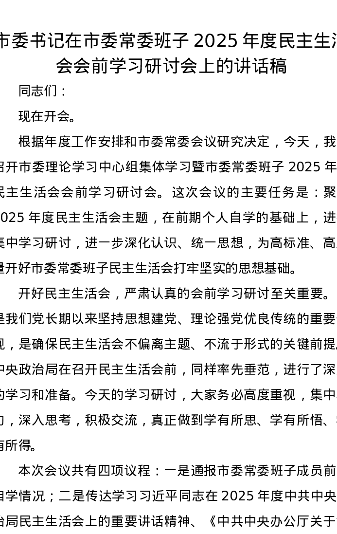 市委书记在市委常委班子2025年度xxxxx会前学习研讨会上的讲话稿