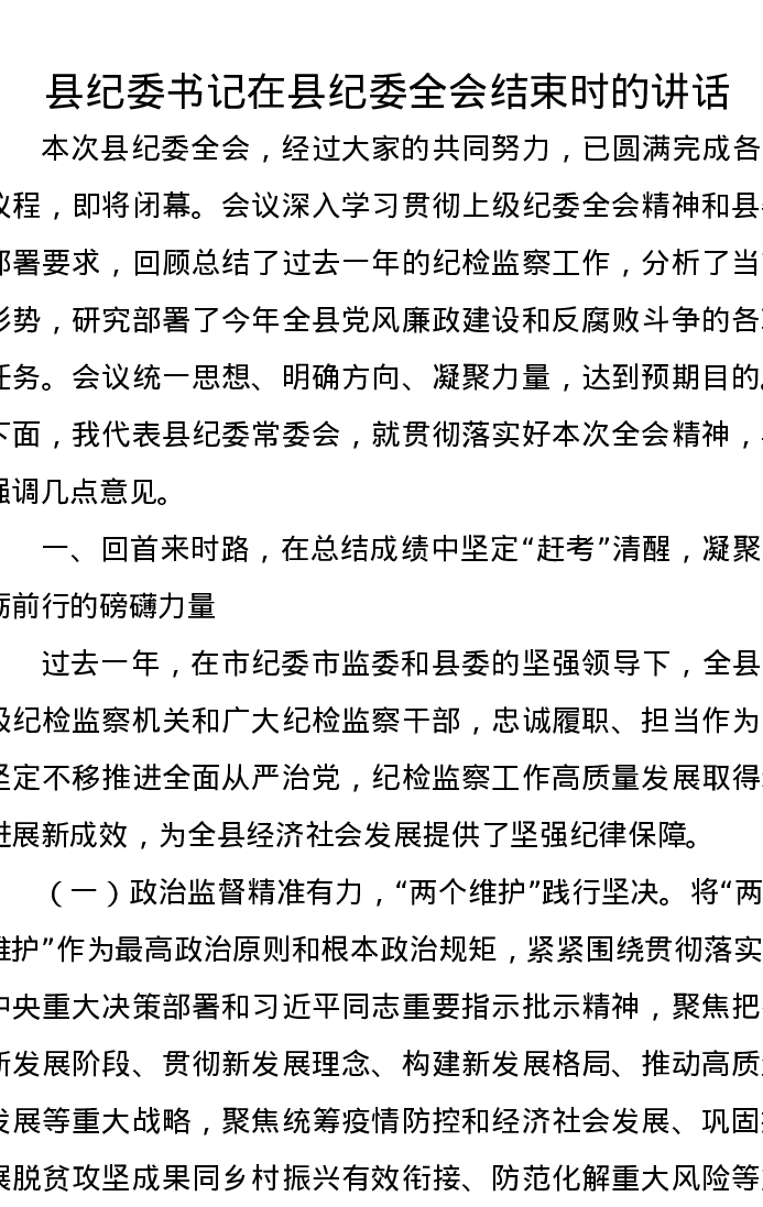 县纪委书记在县纪委全会结束时的讲话