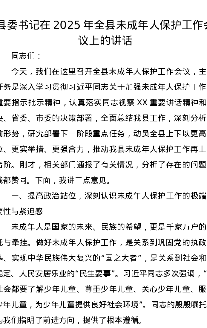 县委书记在2025年全县未成年人保护工作会议上的讲话