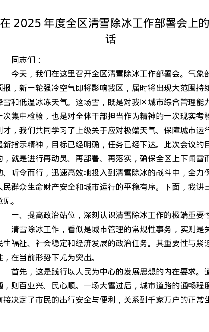 在2025年度全区清雪除冰工作部署会上的讲话