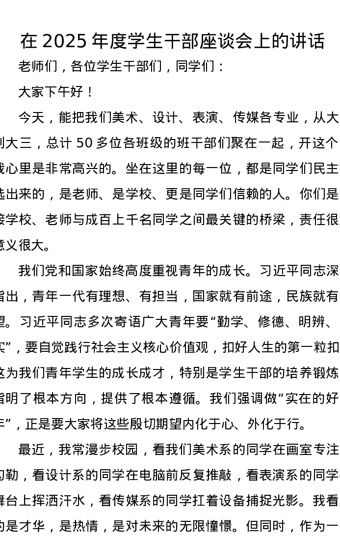 在2025年度学生干部座谈会上的讲话