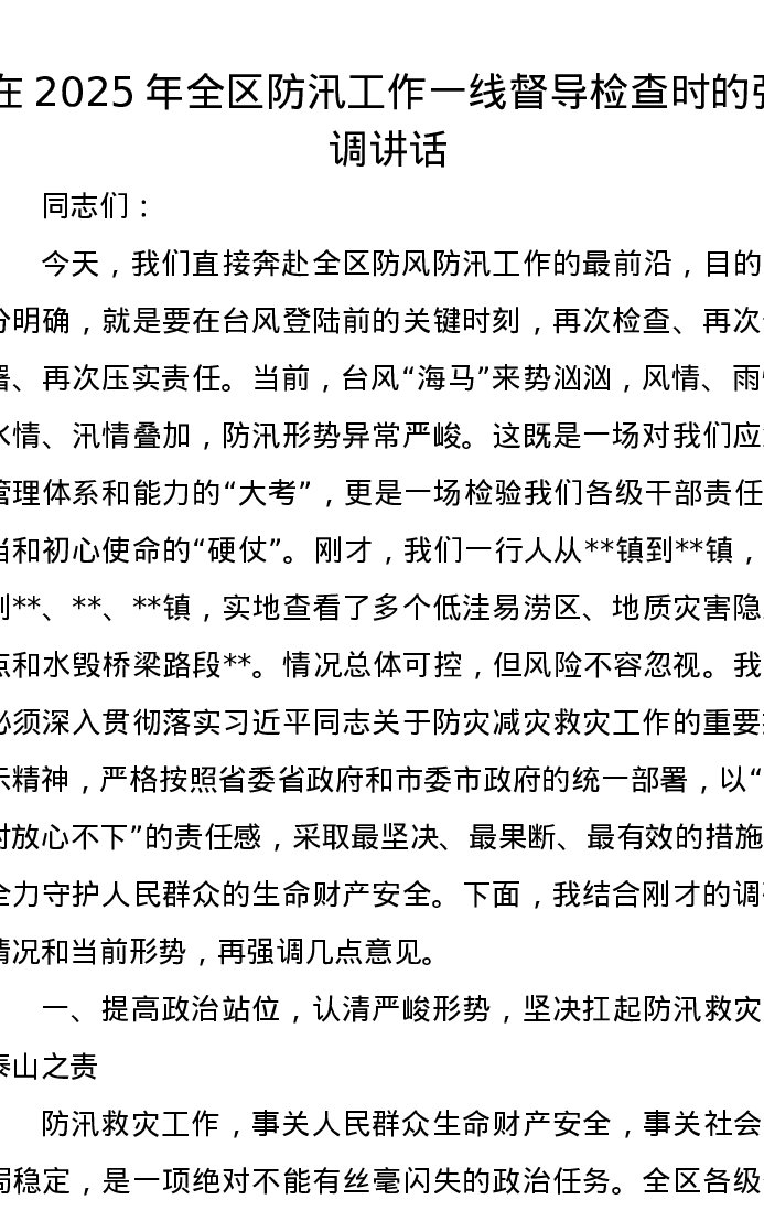 在2025年全区防汛工作一线督导检查时的强调讲话