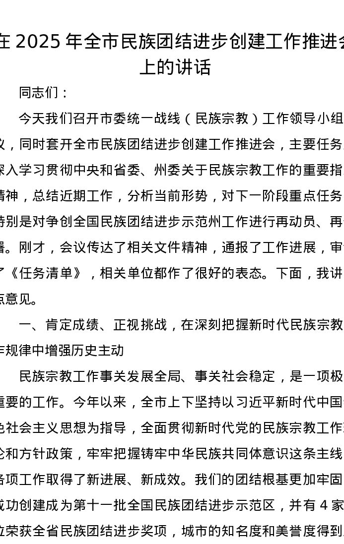 在2025年全市民族团结进步创建工作推进会上的讲话
