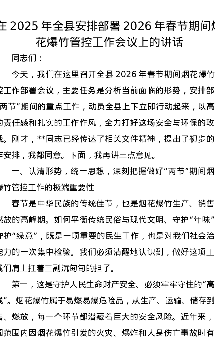 在2025年全县安排部署2026年春节期间烟花爆竹管控工作会议上的讲话