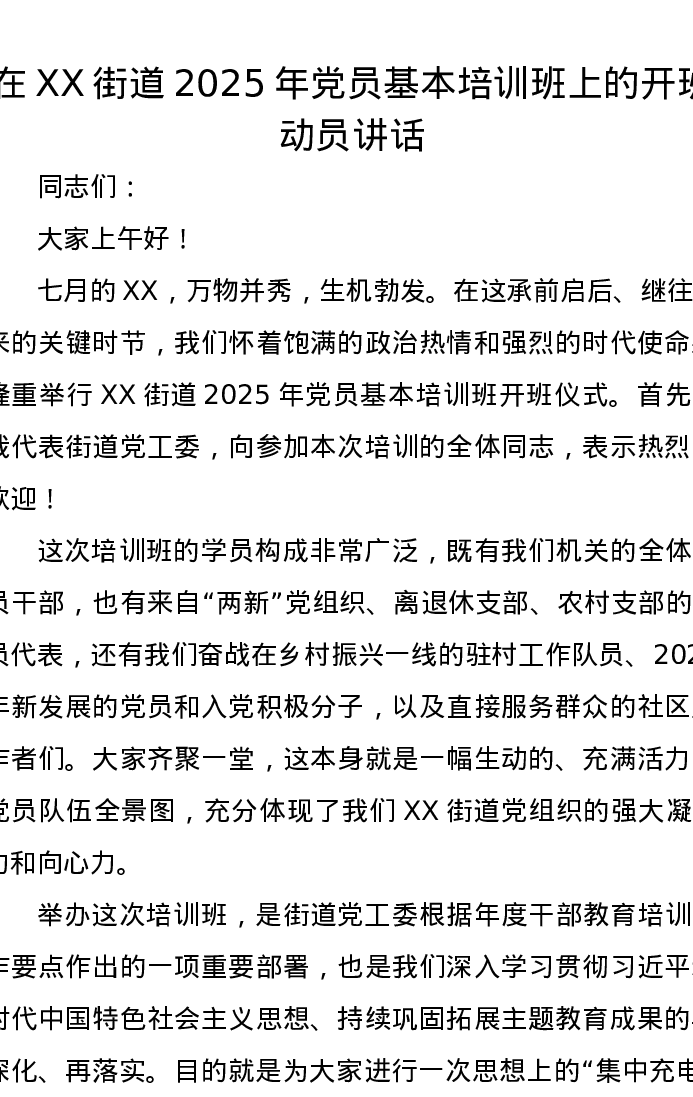 在XX街道2025年党员基本培训班上的开班动员讲话