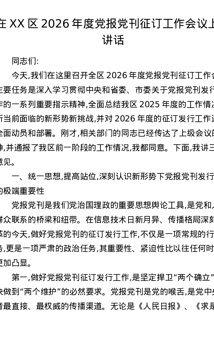 在XX区2026年度党报党刊征订工作会议上的讲话