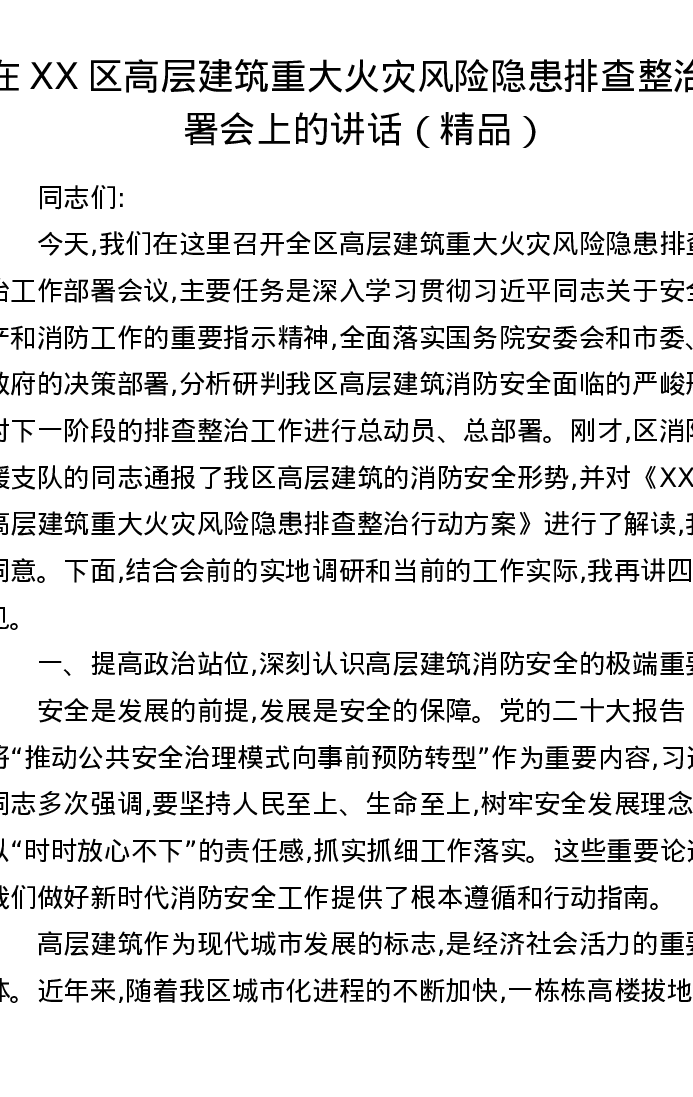 在XX区高层建筑重大火灾风险隐患排查整治部署会上的讲话