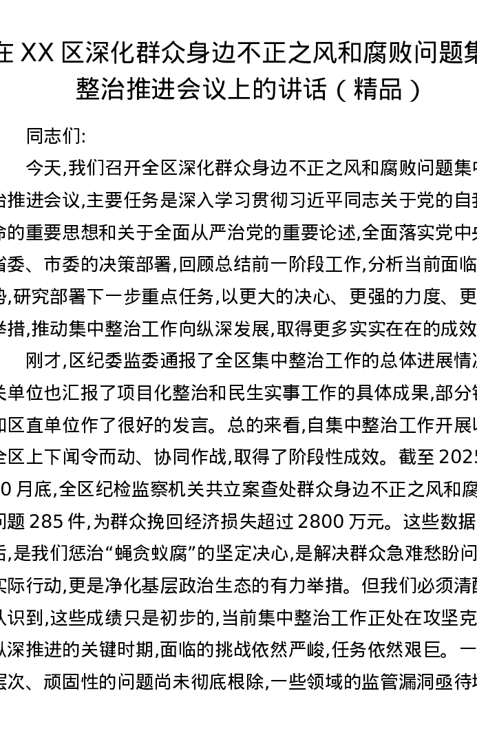 在XX区深化群众身边不正之风和腐败问题集中整治推进会议上的讲话