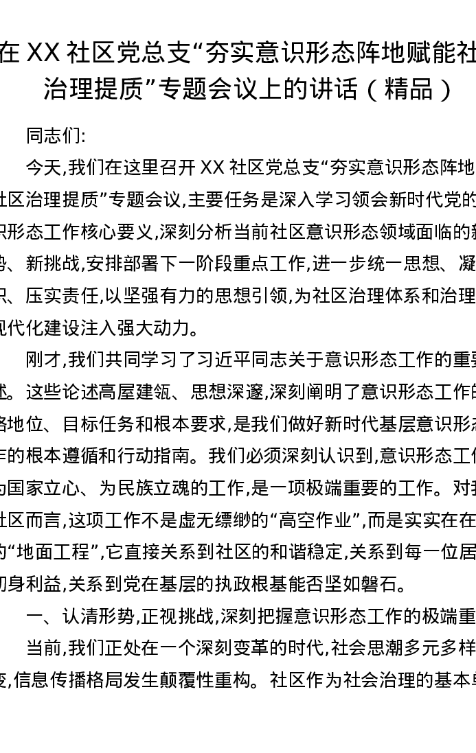 在XX社区党总支夯实意识形态阵地赋能社区治理提质专题会议上的讲话