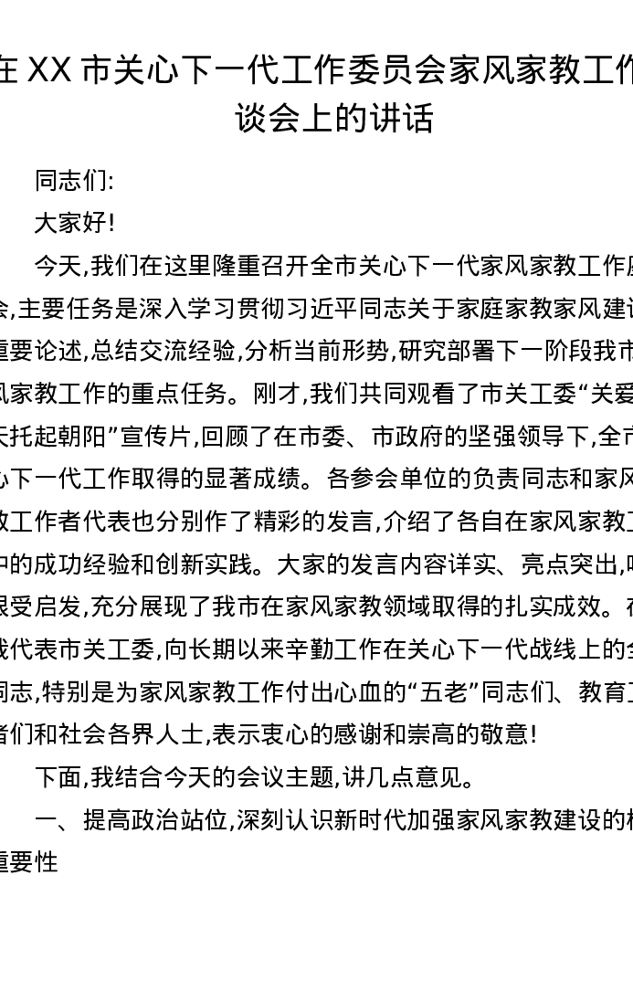 在XX市关心下一代工作委员会家风家教工作座谈会上的讲话