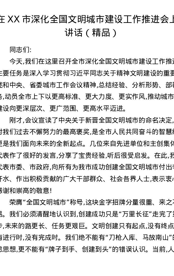 在XX市深化全国文明城市建设工作推进会上的讲话