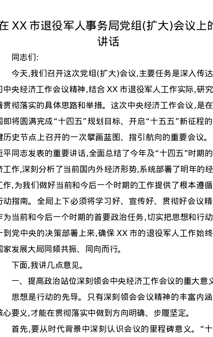 在XX市退役军人事务局党组(扩大)会议上的讲话