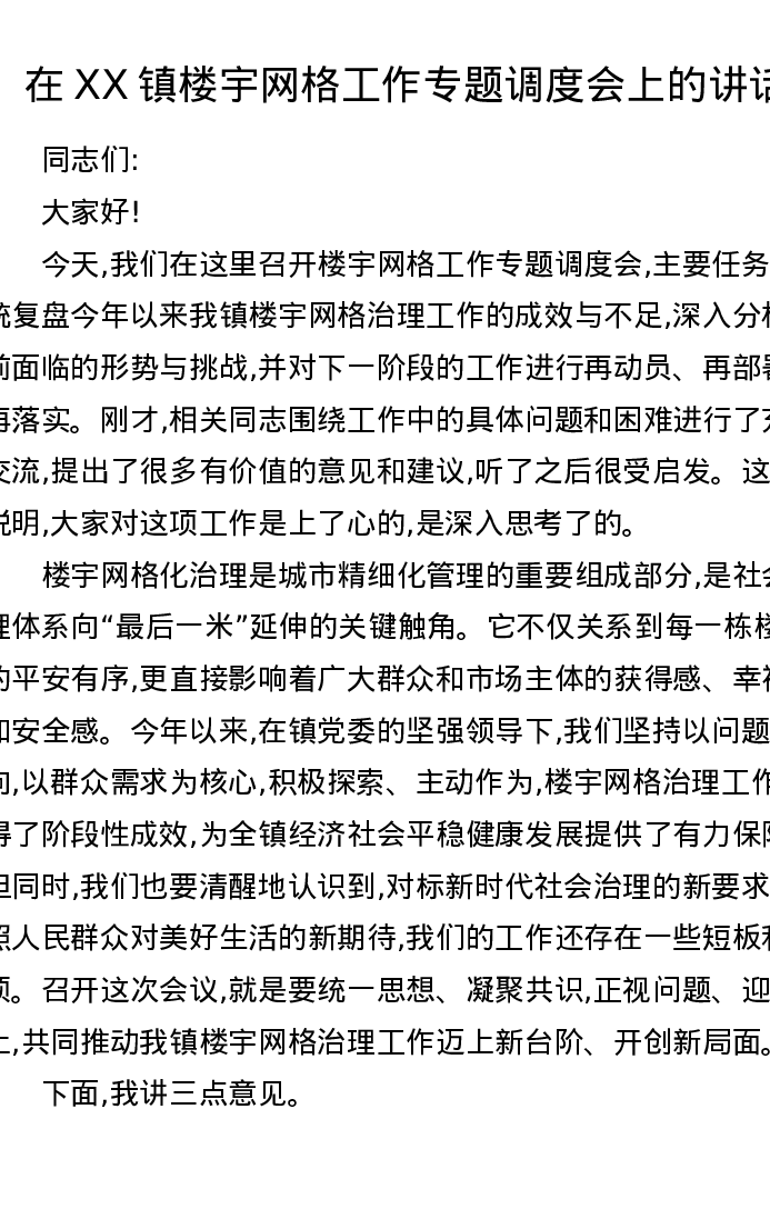 在XX镇楼宇网格工作专题调度会上的讲话