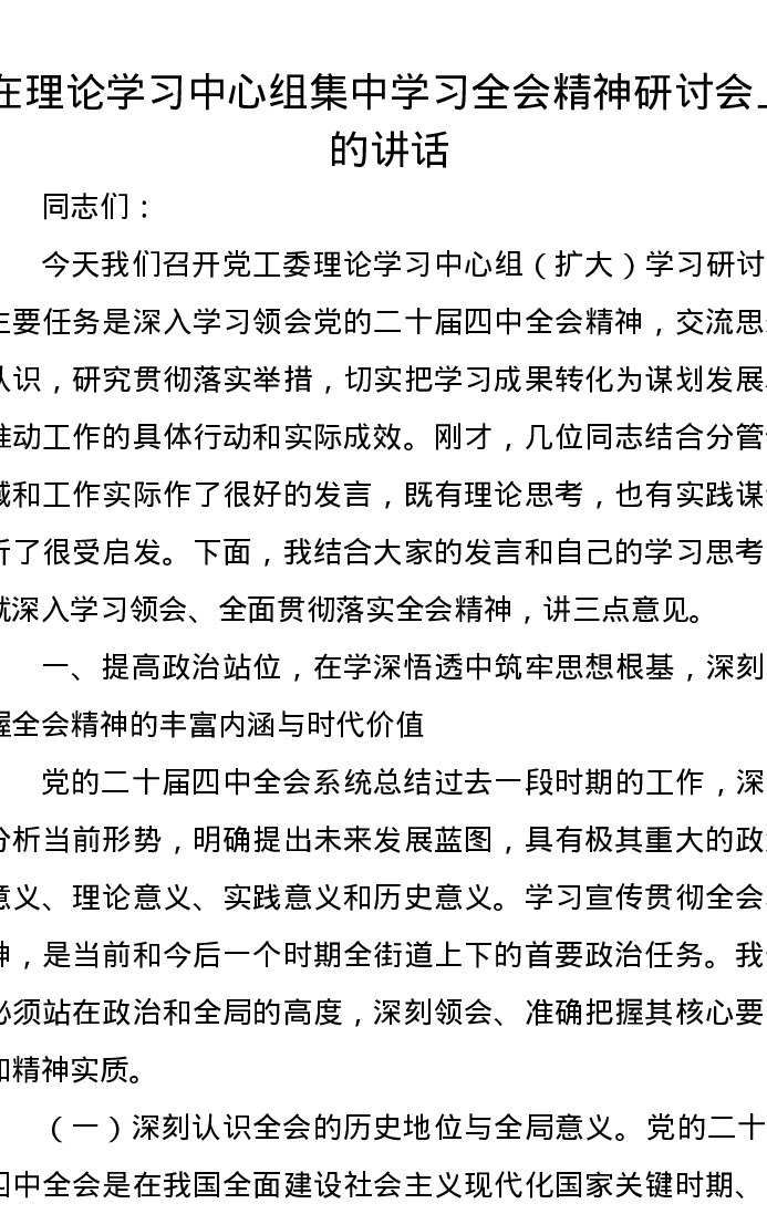 在理论学习中心组集中学习全会精神研讨会上的讲话