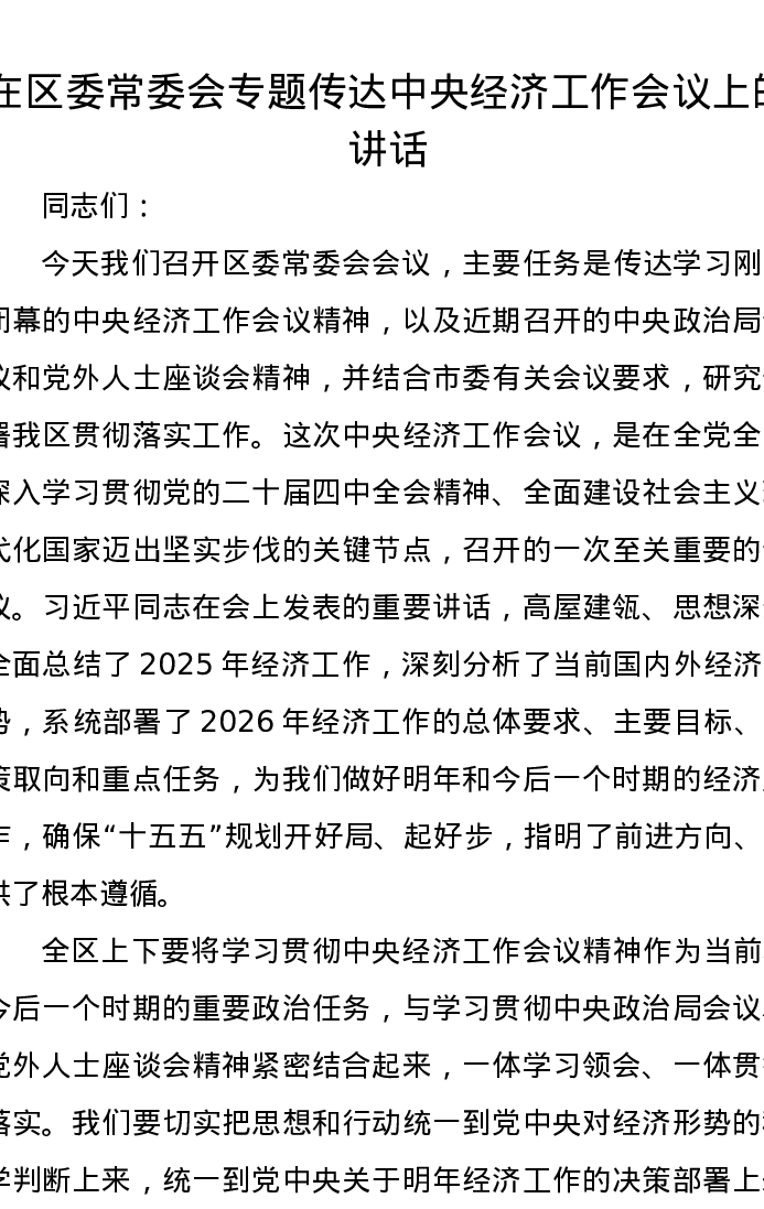 在区委常委会专题传达中央经济工作会议上的讲话