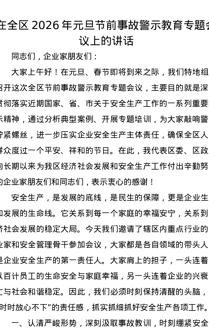 在全区2026年元旦节前事故警示教育专题会议上的讲话