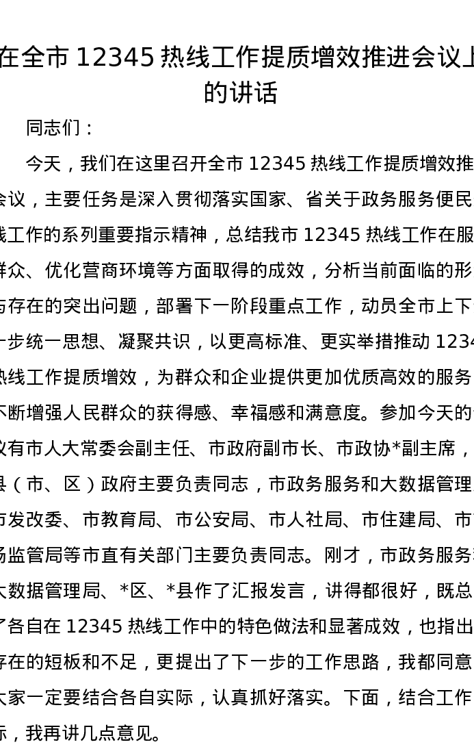 在全市12345热线工作提质增效推进会议上的讲话