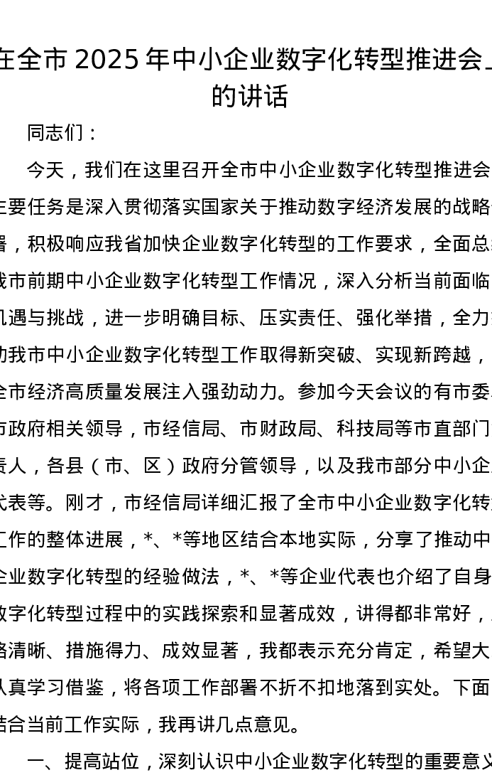 在全市2025年中小企业数字化转型推进会上的讲话